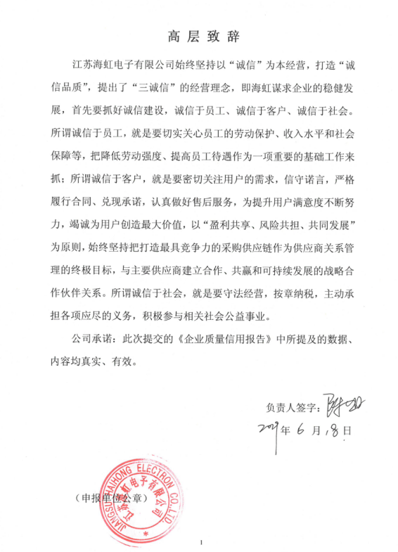 堅定不移踐行“誠信于員工、誠信于顧客、誠信于社會”的經營理念,遵守誠信準則是海虹企業全體員工的道德底線,是海虹企業永續追求質量誠信,履行產品質量主體責任,同時接受社會和顧客的監督。